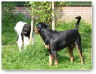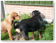 Het is nog steeds 'vol' en dat betekent dat er een flinke roedel loopt. Er logeren erg veel Friese Stabij's die graag samen optrekken. De Friese heren Roefke, Sybe en Jebbe hebben eerst een paar dagen vervelend om elkaar heen gedraaid, de grote vraag blijft wie van hen de baas mag zijn. Vandaag kwam Chef, de ongecastreerde Zwitserse Sennen binnen en de vraag bestond niet meer. Af en toe zoekt Chef de heren op om ze even intimiderend aan te staren en dan druipen ze af...ok...ok...jij bent 'm.